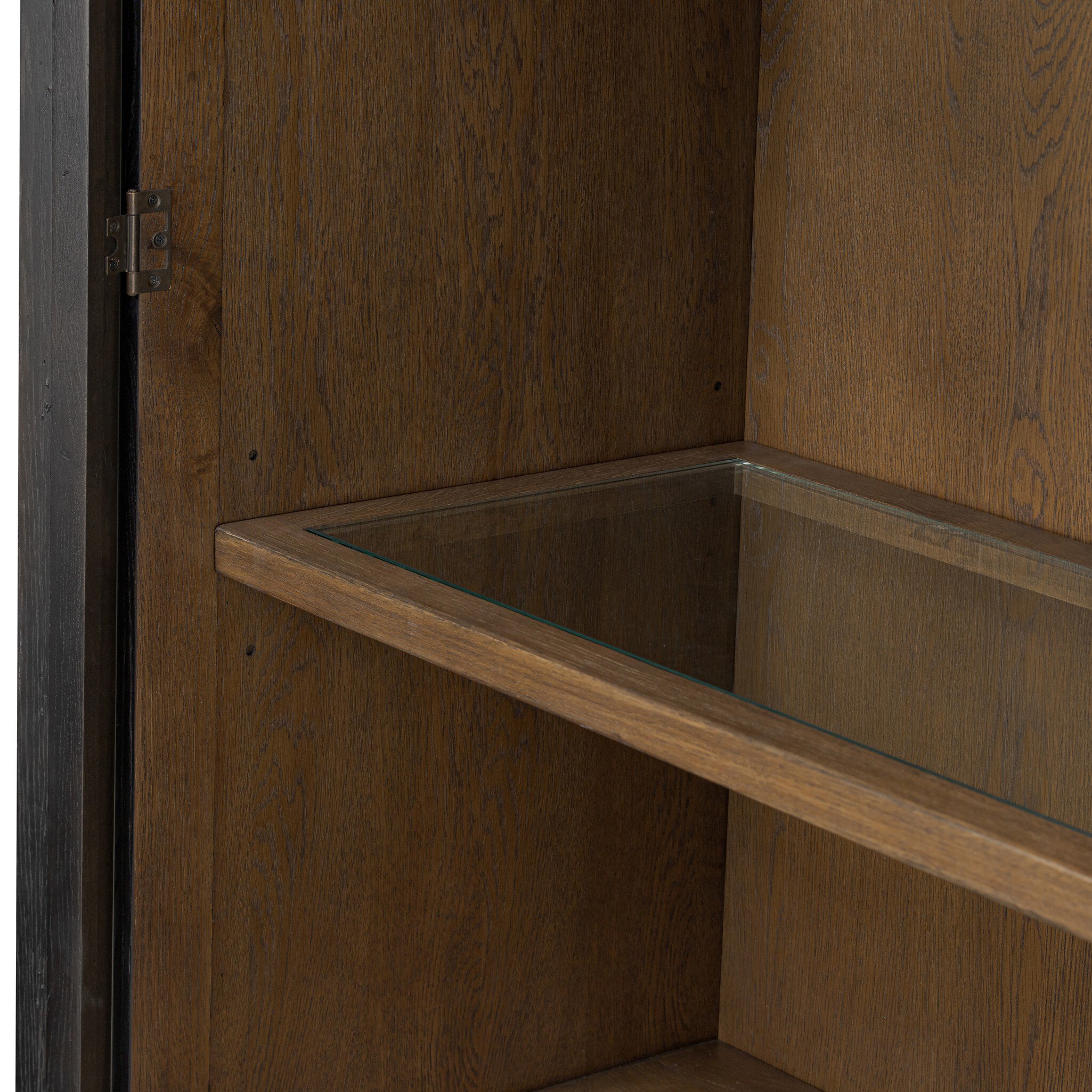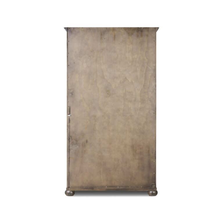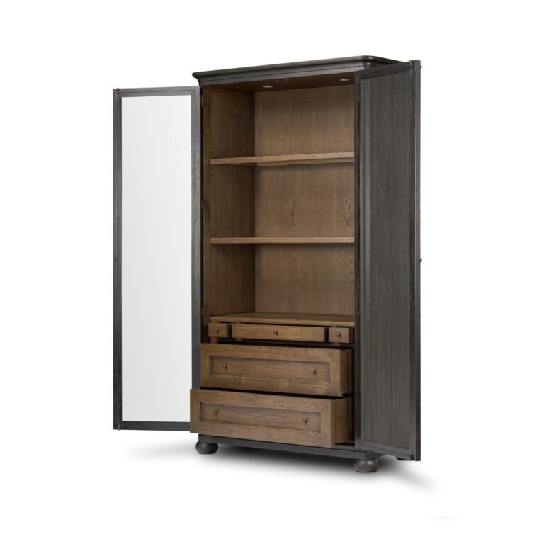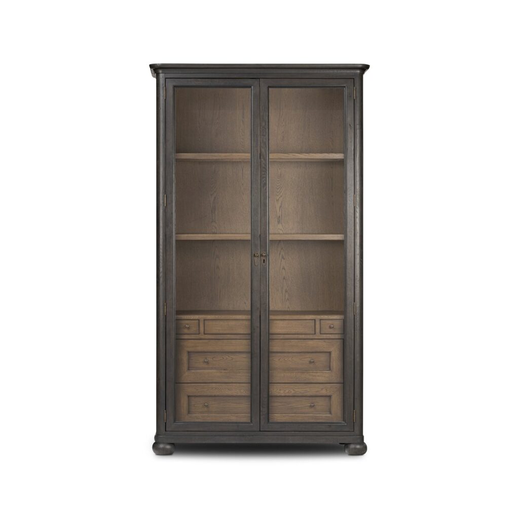 Rich in details, this smoked black-finished cabinet features rounded edges, bun feet and a smooth cornice on top, complete with glass doors and faux key plates for added character. Inside, five drawers of varied sizes and shelves offer ample storage options, complete with a spiced oak finish. Two puck lights provide accent lighting. A design collaboration by Amber Lewis and Four Hands. This item has limited online distribution and may not be sold on websites without prior approval. Visit the FAQ page in our Help Center for more details.