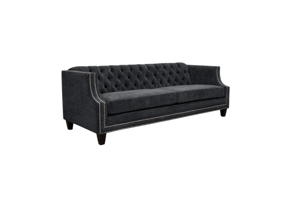 Kiln-dried hardwood frame. Sinuous spring system. Eco-friendly construction. Soy-based, fibre wrapped, 2.2 gel infused foam seat cushions. Fibre filled back cushions. Loose seats and tufted back. Nail head detail on arms and bottom band. Available in fabric or leather. Bench-made in Canada.