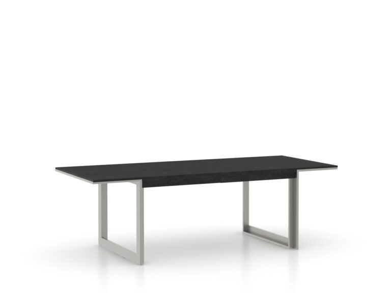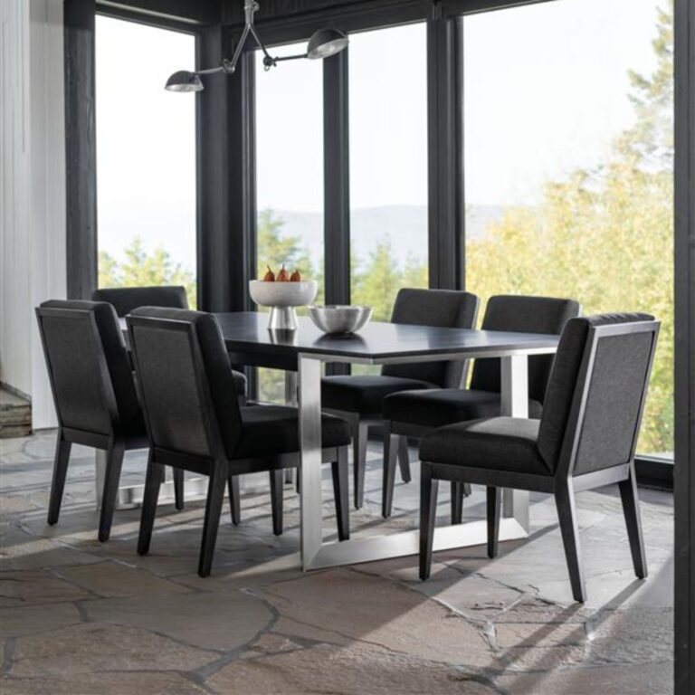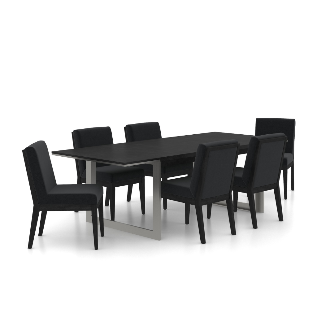 Elegant and structured, this dining set from the Modern collection captivates with its architectural appeal. The silver base contrasts beautifully with the dark tabletop. Choose the wood tone, fabrics, and dimensions to create the perfect look for your space.