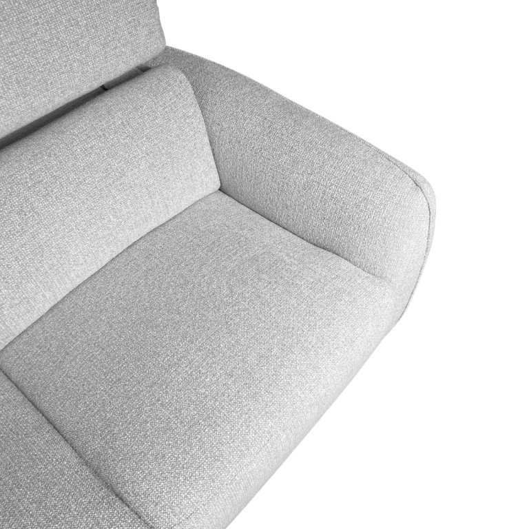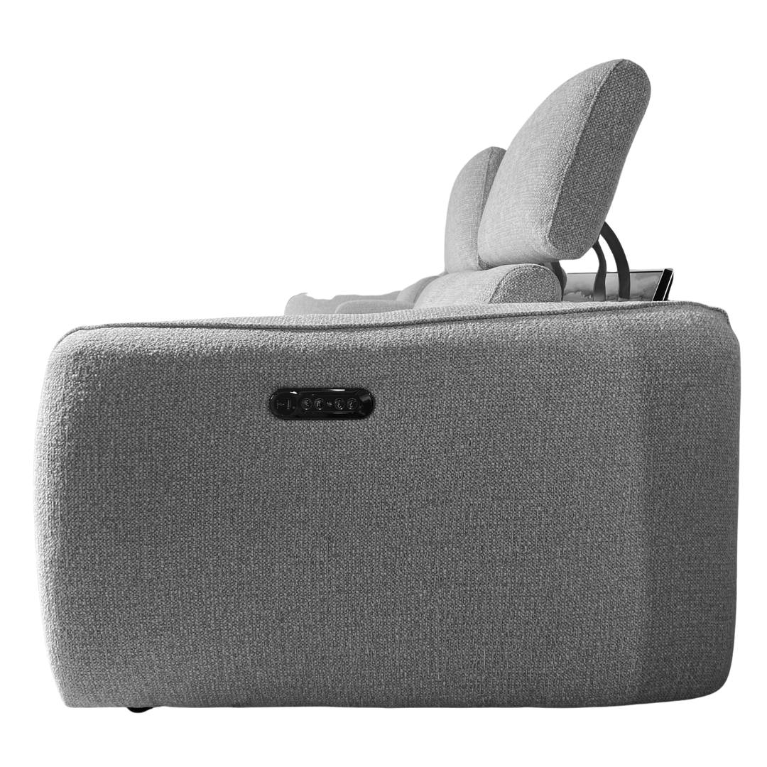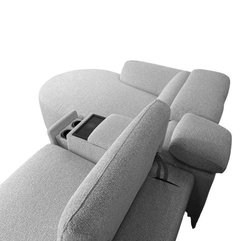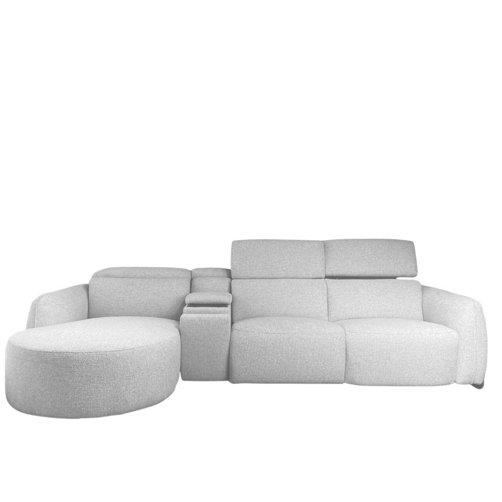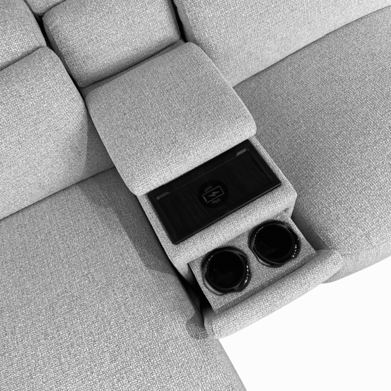 Elevate your living space with this modern sectional designed for both comfort and convenience. Featuring a sleek, rounded bumper chaise, this piece brings a soft contemporary silhouette to any room. Thoughtfully equipped with built-in consoles that include wireless phone charging and hidden cupholders, it’s perfect for relaxing or entertaining. One seat features a power recliner for personalized comfort at the touch of a button. Stocked in the stylish color shown, or customize it in your choice of fabric or leather to suit your space.